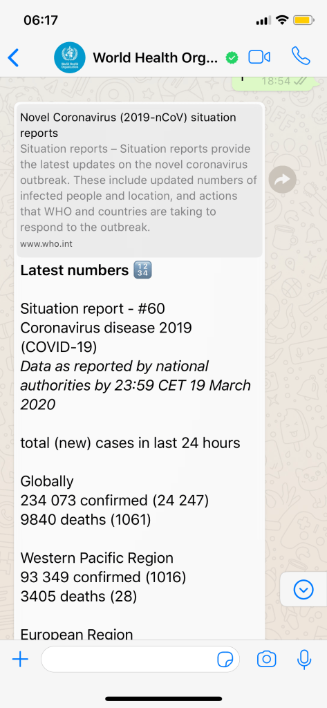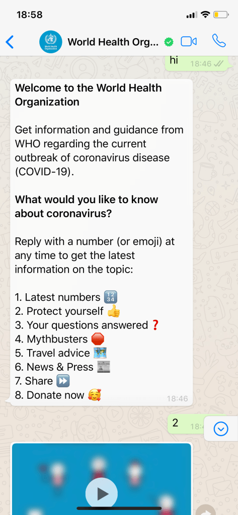 I tried the messaging service myself after logging onto WhatsApp and was impressed with the information I received (screen shots are below). If you would like accurate, up to date information about the Coronavirus pandemic, I highly recommend the World Health Organization’s WhatsApp messaging service. To learn more, here is the original article: https://www.who.int/news-room/feature-stories/detail/who-health-alert-brings-covid-19-facts-to-billions-via-whatsapp.